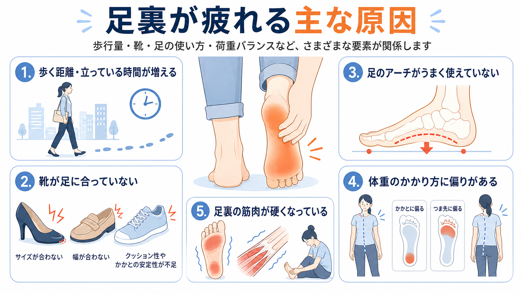 足裏が疲れる原因には、歩く距離の増加、立ち時間の増加、靴の不一致、足のアーチ機能、体重のかかり方の偏りなどが関係しています。